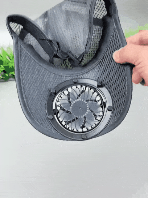 The Solar Rechargeable Peak Cap: Your personal cooling system for the great outdoors.