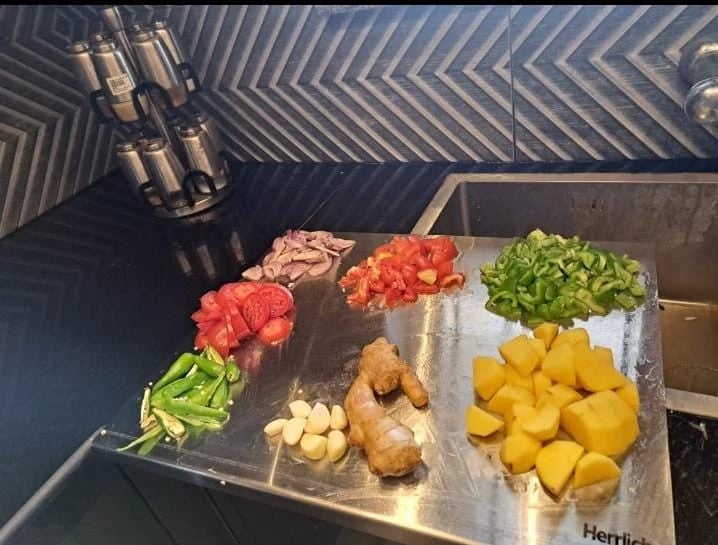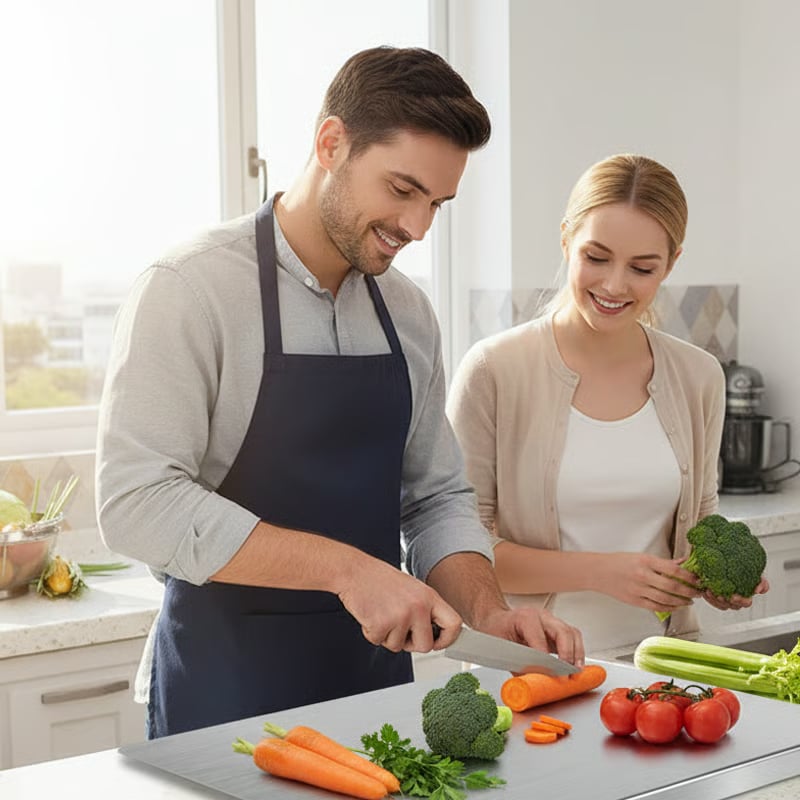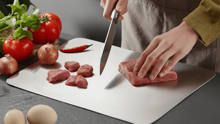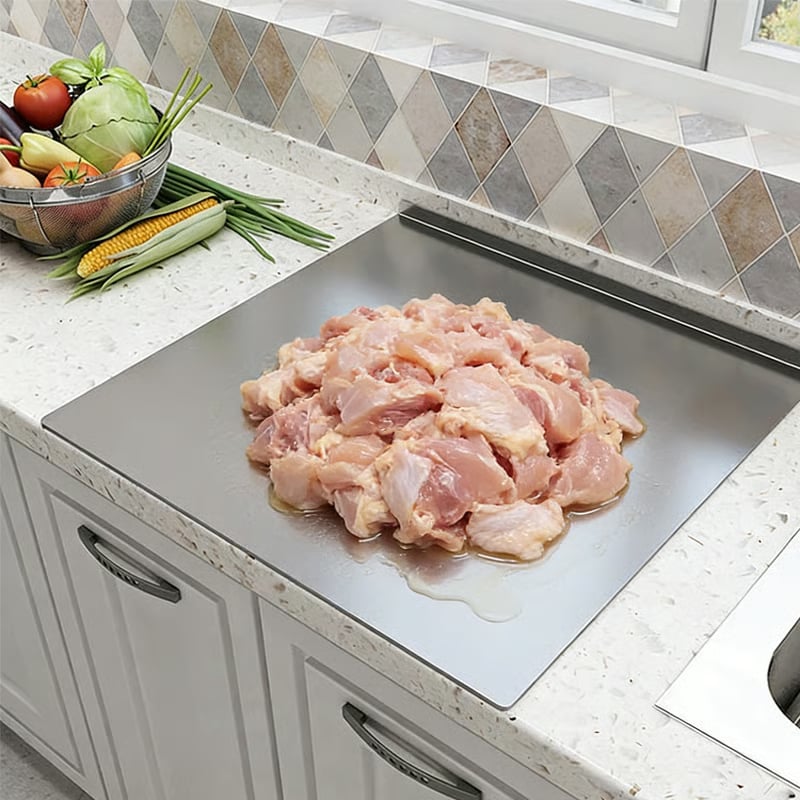 The Stainless Steel Cutting Board features a completely non-porous surface that prevents bacteria from hiding in grooves or cracks. Unlike wooden boards that absorb meat juices or plastic boards that develop knife scars, this sleek steel surface ensures nothing penetrates the surface.